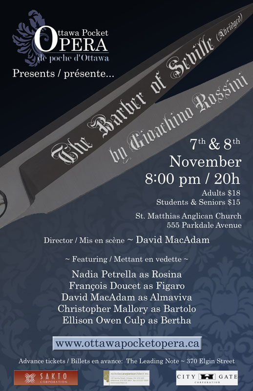 will be presenting 'The Barber of Seville' at the Riviera theatre in Buffalo, NY on Friday June 26th at 8pm and Sunday June 28th at 2:30pm. This is a co-production with the Ottawa Pocket Opera directed by David Macadam and The Eastern Festival Symphony Orchestra under the baton of Zach Kampler.
