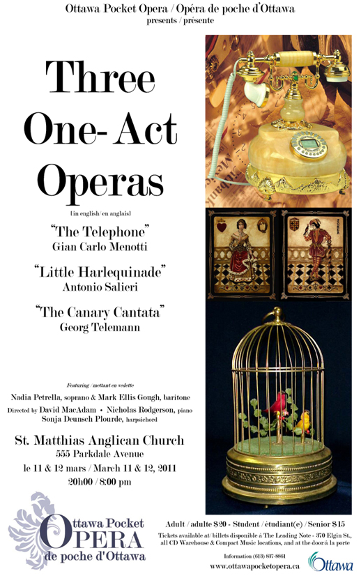 Menotti's sparkling, timeless story of Lucy's penchant for telephone communication leading to a lack of communication with her lover, paired with Telemann's touching (and comic...) tribute to a fallen master of song, with it's surprising revelation of "murder"! Featuring OPO regular soprano Nadia Petrella and the OPO début of baritone Mark Gough, known to Ottawa audiences through his appearances with Opera Lyra Ottawa and Pellegrini Opera. Also on the program: Salieri's Little Harlequinade (possibly an Ottawa premiere!) along with staged arias and duets.